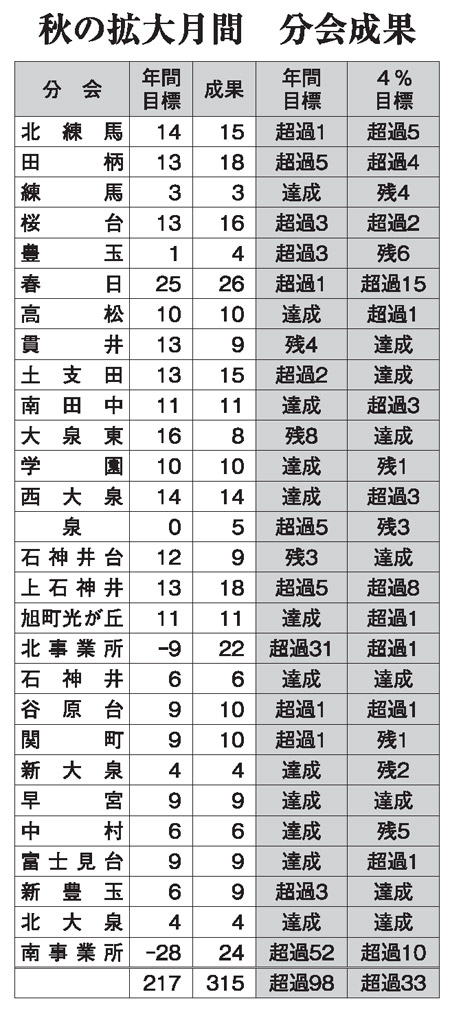 2013年「秋の拡大月間」は25分会が年間目標を達成し、3分会が月間4%目標を達成しました。練馬支部は秋の月間で315人の新たな仲間を迎え、11月1日現勢を6939人とし、7000人支部回復まで後一歩の到達を築きました。また、それぞれ会員拡大に取り組んだ、主婦の会・青年部・シニア友の会も目標を達成しました。