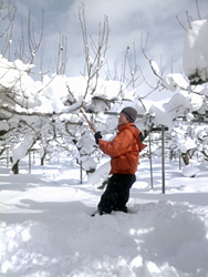 おきたま産直センターはお米以外に野菜・果樹等も扱っています。人気のさくらんぼやりんご、ぶどう、ラフランスなどなど。そんな果樹農家のこの時期の仕事と言えば、木の「雪下ろし」です。大事な枝を雪から守り、皆さんにおいしい果実を届けるために、時には防寒着を脱ぎ背中から湯気を出しながら頑張っています。練馬の皆様、ご紹介の際には、お米以外にも、いろんな苦労や工夫の実った美味しい果物もぜひお試し下さい♪